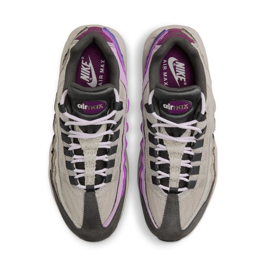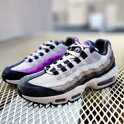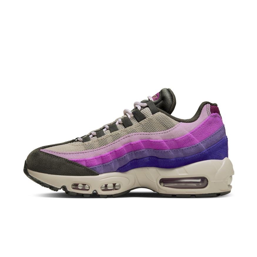 Taking inspiration from past grails and fast-paced '90s track aesthetics, this new-money twist on the Air Max 95 is your street style currency. Richly textured fabrics like suede, corduroy, and open mesh set a premium stage for the independent designs flanking both sides of the shoe. On the outside, a safari pattern nods to Air Max history. On the inside, brilliant Viotech overlaps with 3 more shades of purple to make you feel like royalty. Lace up and feel the abundance.